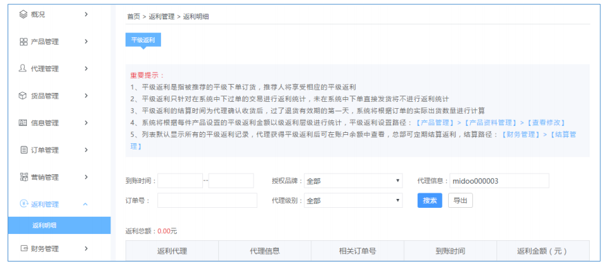 返利管理系統(tǒng),平級返利、推薦返利、分銷返傭,多種方式激勵代理團隊部發(fā)展;