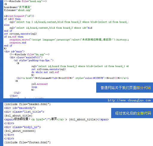 上面圖片中的比較大家可以看出普通的網(wǎng)站代碼和優(yōu)化后的代碼之間的差別,都是將頭文件和腳文件分離出來的,創(chuàng)絡(luò)已經(jīng)可以將網(wǎng)站某一個(gè)內(nèi)頁(yè)的程序精簡(jiǎn)到20行以內(nèi)。對(duì)比后我們就不難理解為什么模板網(wǎng)站的程序包通常有接近10MB大小,而獨(dú)立開發(fā)的網(wǎng)站只有3MB左右。甚至曾經(jīng)有一位客戶的大型ASP網(wǎng)站全部文件加在一起后竟達(dá)到了160MB,而經(jīng)過創(chuàng)絡(luò)重新使用PHP獨(dú)立開發(fā)后,整個(gè)網(wǎng)站還沒有超過20MB,這還是導(dǎo)入了原有舊網(wǎng)站的數(shù)據(jù)資料以后的大小。這里就可以看出網(wǎng)站的代碼繁簡(jiǎn)度之間有什么差別了。